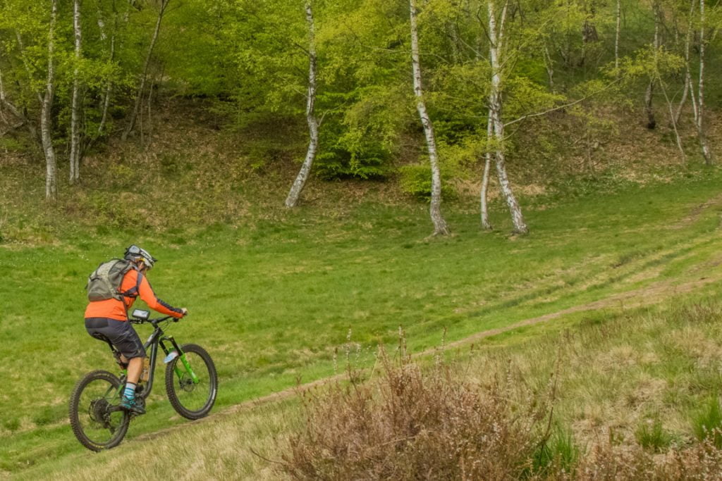 Okay, we joked a little bit, but only up to a point. We get ready for the descent, the real central moment of the day. Forget about words, this descent is fantastic, I will definitely come back other times, maybe going up from different places, but from here I have to go down again, again and again. It starts with a clean beech forest, with a terrain that seems to be laid, where the knobs cling and the bike remains there, not a skid or a hint of insecurity, counter-slope curves, lines that you have to decide at the moment and the fluidity that must be sought with constancy.